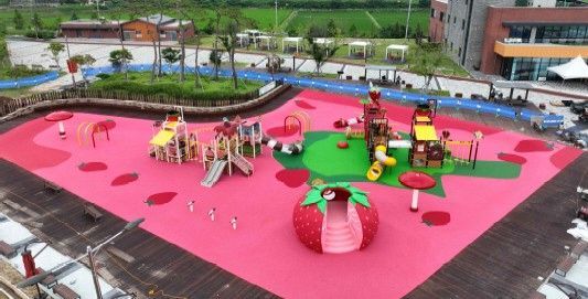 ‘논산 딸기향 농촌 테마공원’은 지역을 대표하는 특산물인 딸기를 테마로 한 특색있는 디자인을 자랑하고 있다.