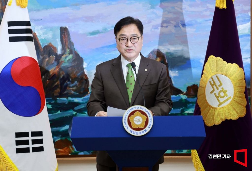 우원식 국회의장이 11일 국회에서 시국 관련 기자회견을 하고 있다.