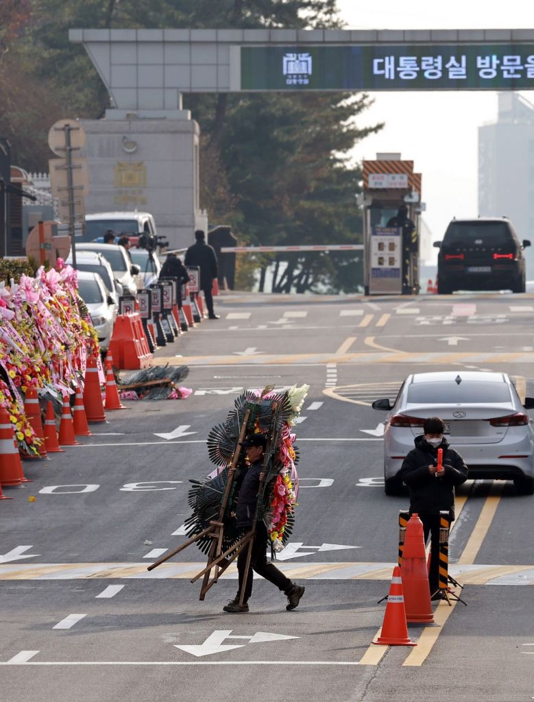 11일 경찰청 특별수사단에서 서울 용산 대통령실을 압수수색 중인 가운데 대통령실 정문 진입로 담에는 윤석열 대통령을 응원하는 화환들이 줄지어 있고 화환들이 계속 배달되고 있다.