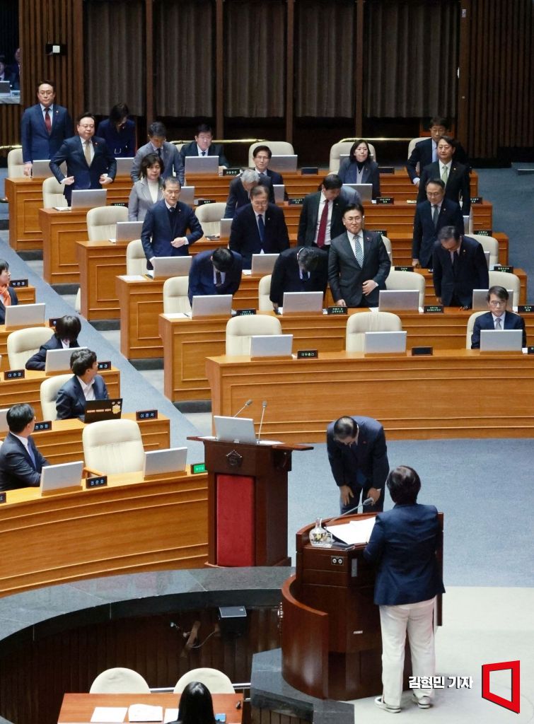 한덕수 국무총리를 비롯한 국무위원들이 11일 국회 본회의에서 진행된 '윤석열 대통령 위헌적 비상계엄 선포 내란행위 관련 긴급현안질문'에서 서영교 더불어민주당 의원의 요구에 따라 허리 숙여 대국민 사과 인사를 하고 있다.