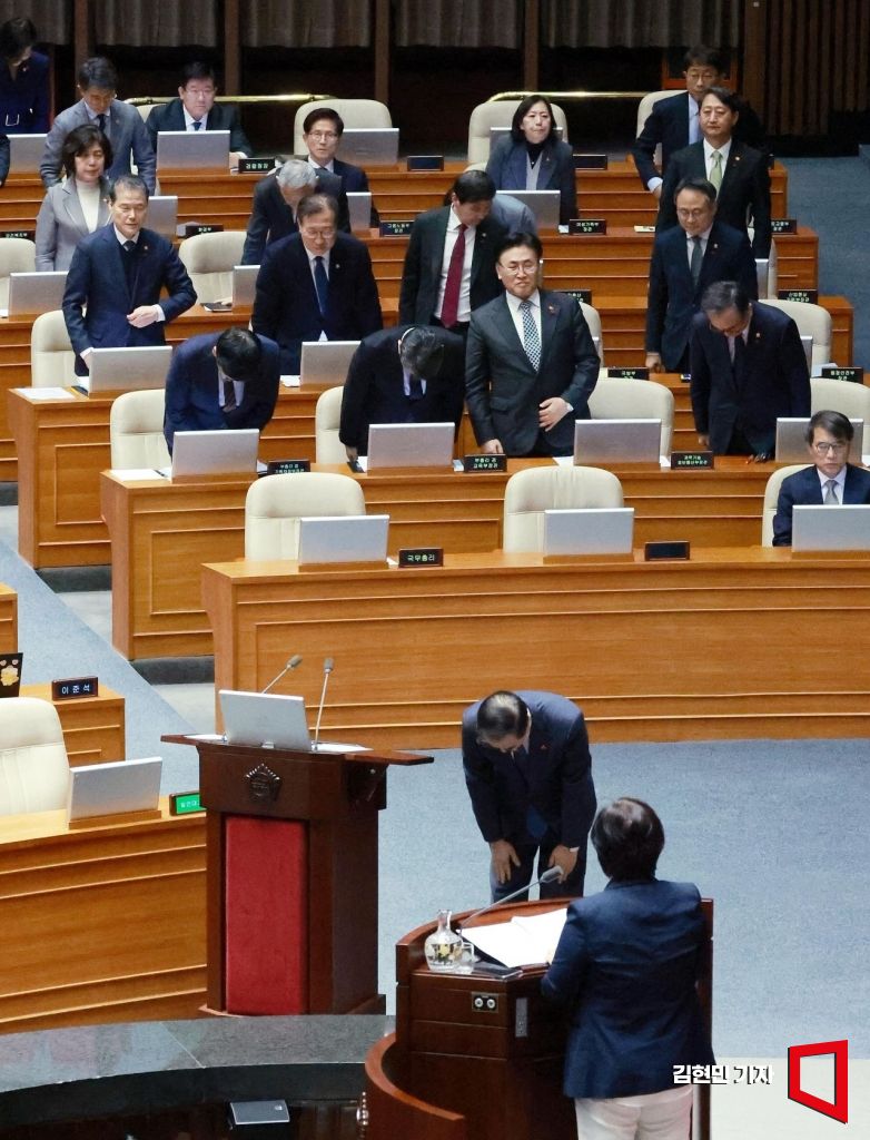 한덕수 국무총리를 비롯한 국무위원들이 11일 국회 본회의에서 진행된 '윤석열 대통령 위헌적 비상계엄 선포 내란행위 관련 긴급현안질문'에서 서영교 더불어민주당 의원의 요구에 따라 허리 숙여 대국민 사과 인사를 하고 있다.