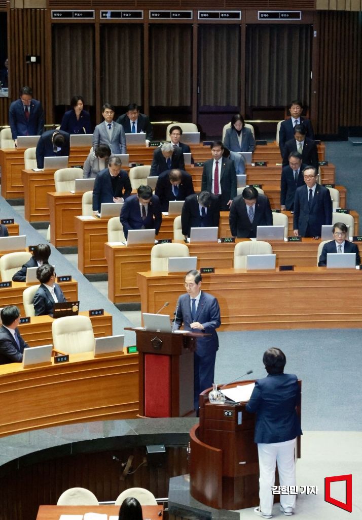 한덕수 국무총리를 비롯한 국무위원들이 11일 국회 본회의장에서 진행된 '윤석열 대통령 위헌적 비상계엄 선포 내란행위 관련 긴급현안질문'에서 서영교 더불어민주당 의원의 요구에 따라 허리 숙여 대국민 사과 인사를 하고 있다. 김현민 기자