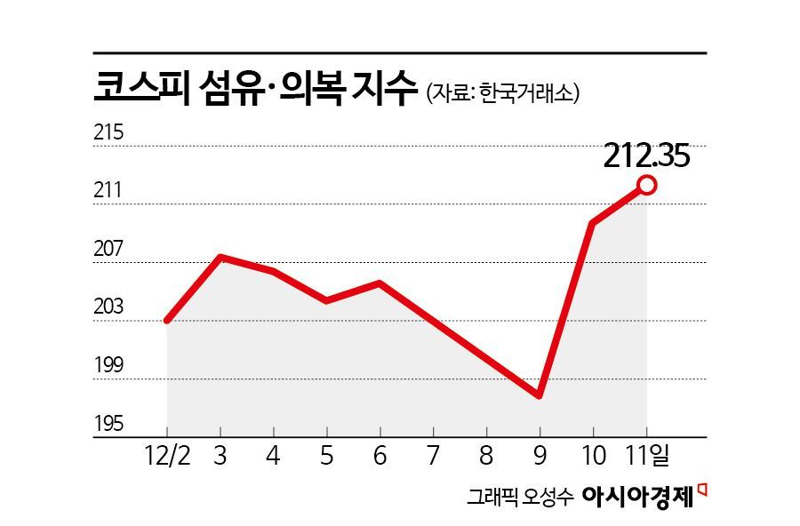 12일 한국거래소에 따르면 윤석열 대통령의 비상계엄이 해제된 지난 4일부터 전일까지 코스피 업종 지수 중 가장 양호한 수익률을 기록한 업종은 섬유·의복 지수인 것으로 나타났다. 해당 기간 코스피는 2.30% 밀렸으나 섬유·의복 지수는 2.39% 올랐다. 이 지수는 F&F, 한세실업, 한섬, 제이에스코퍼레이션 등 국내 주요 의류 브랜드 및 주문자상표부착생산(OEM) 기업 등으로 구성된다.