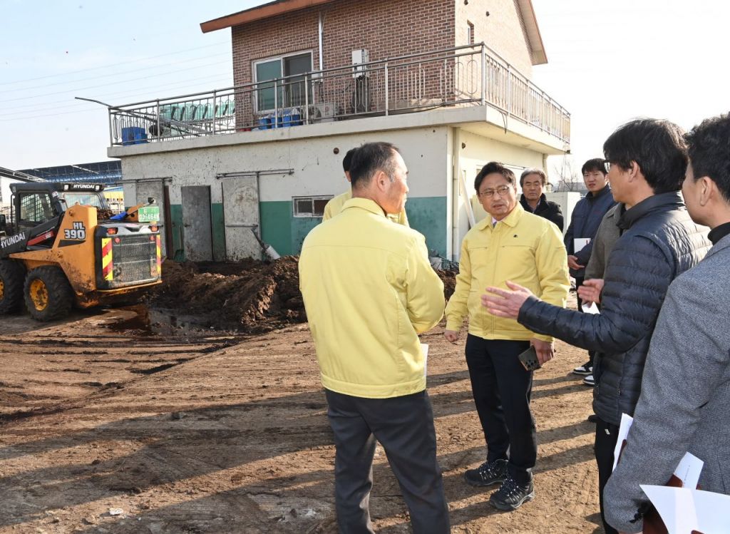 오후석 행정2부지사가 11일 폭설로 큰 피해를 입은 평택시 축산농가를 찾아 복구 진행상황을 점검하고 관계자에게 설명을 듣고 있다. 경기도 제공