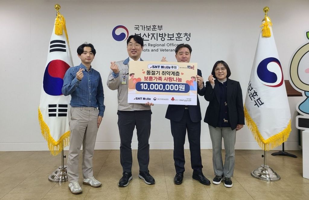 SNT모티브(대표 권형순)는 보훈가족의 따뜻한 겨울나기에 도움이 될 수 있도록 성금 1000만원을 전달했으며, 부산지방보훈청은 SNT모티브의 후원으로 재가복지대상자와 고령 취약계층 350가구에 1인당 5㎏의 김장을 지원할 예정이다.