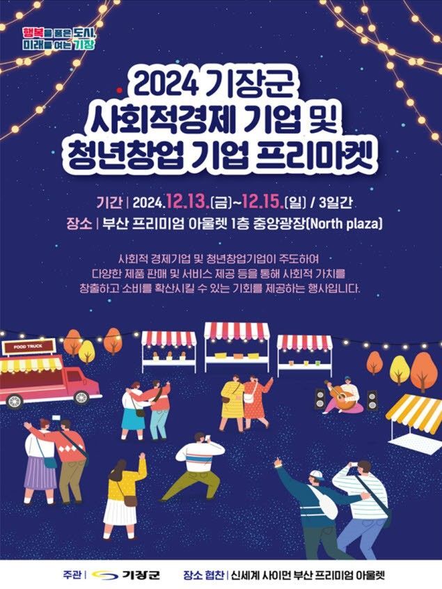 부산 기장군(군수 정종복)은 오는 13일부터 15일까지 3일간 유동 인구가 많은 신세계사이먼 부산프리미엄아울렛 1층 중앙광장(North plaza)에서 ‘2024년 기장군 사회적 경제기업·청년창업기업 프리마켓’을 개최한다.