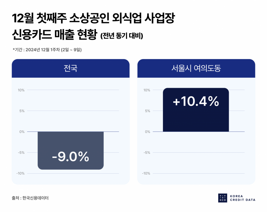 12.3 비상계엄 선포와 이에 따른 대통령 탄핵 추진으로 정국이 요동치면서 외식업 소상공인의 연말 대목이 실종됐다. 식당을 하는 소상공인의 매출은 12월 첫째 주 전년 대비 10% 가까이 줄어 직격탄을 맞았다. 눈에 띄는 것은 전국에 걸쳐 소상공인 매출이 감소한 상황에서 서울 여의도동에서만 10% 이상 증가세를 보였다는 점이다. 여의도에 탄핵을 촉구하는 인파가 몰리고 있는 데 따른 것으로 분석된다.