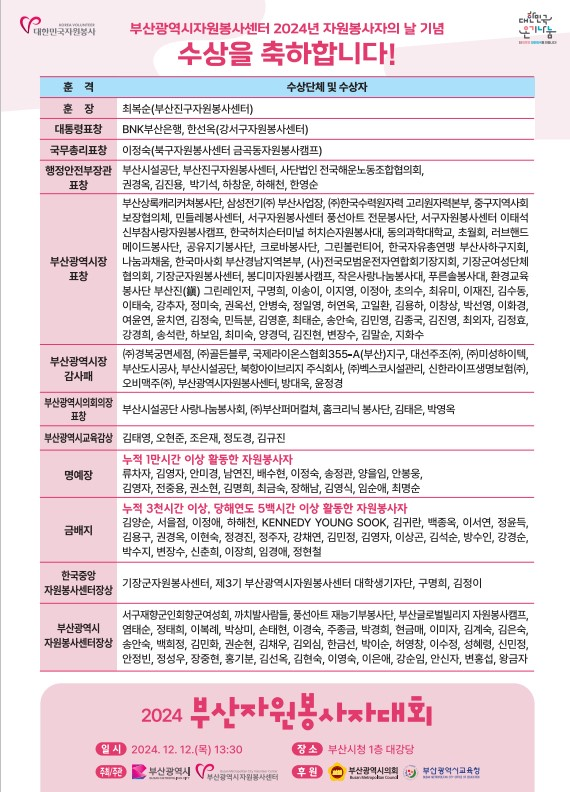 자원봉사 유공 국민훈장 석류장 1점, 대통령표창 1점, 국무총리표창 1점, 행정안전부장관표창 7점, 부산시장표창 27점, 부산시의회의장표창 4점, 부산시교육감상 3점, 자원봉사 명예장(자원봉사 누적 실적 1만시간 이상) 16점, 자원봉사 금배지(자원봉사 누적 실적 3000시간, 당해연도 500시간 이상) 17점 등 총 94점을 수여해 자원봉사자들을 격려할 계획이다.