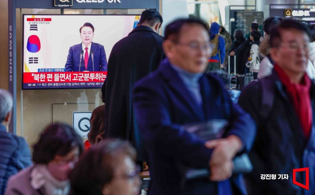 12일 서울역 대합실에서 시민들이 윤석열 대통령의 계엄령 선포에 대한 긴급 입장 발표를 보고 있다.