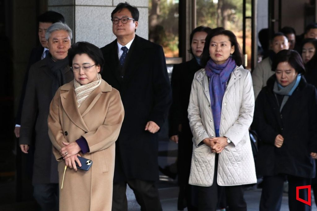 12일 서울 서초구 대법원에서 열린 자녀 입시비리와 청와대 감찰무마 등 혐의로 징역 2년 실형이 선고된 조국 조국혁신당 대표의 상고심 선고 방청을 마친 김선민 의원 등 조국혁신당 의원들이 법정을 나서고 있다. 사진공동취재단