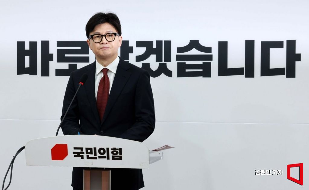한동훈 국민의힘 대표가 12일 국회에서 윤석열 대통령 탄핵과 관련한 긴급 기자회견을 하고 있다. 김현민 기자