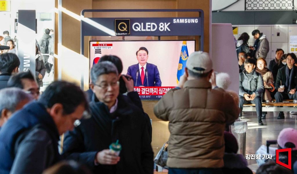 12일 서울역 대합실에서 시민들이 윤석열 대통령의 계엄령 선포에 대한 긴급 입장 발표를 보고 있다. 강진형 기자