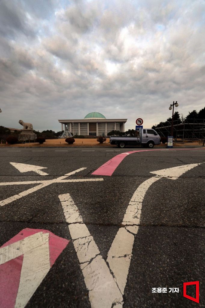 윤석열 대통령 탄핵 2차 표결을 하루 앞둔 13일 서울 여의도 국회의사당 본청이 짙은 구름에 덮혀 있다. 탄핵 2차 표결을 앞두고 한국정치가 갈림길에 서 있다. 조용준 기자
