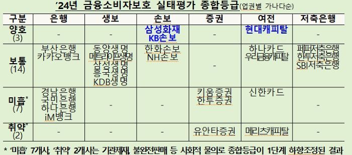 삼성화재, KB손해보험, 현대캐피탈이 금융소비자보호 실태평가에서 가장 높은 등급한 '양호' 평가를 받았다. 반면 소비자보호 관련 기관제재, 불완전판매 등으로 사적으로 물의를 일으킨 경남은행, 국민은행, 하나은행, iM뱅크, 키움증권, 한투증권, 신한카드 등은 보통에서 미흡 등급으로 하향조정됐고 유안타증권, 메리츠캐피탈은 미흡에서 취약 등급으로 추락했다.