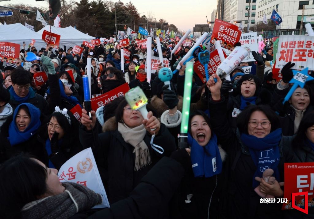 윤석열 대통령에 대한 2차 탄핵 표결에서 탄핵소추안이 가결된 후 서울 여의도 국회의사당 앞에 운집한 집회 참가자들이 환호하며 춤을 추고 있다. 허영한 기자