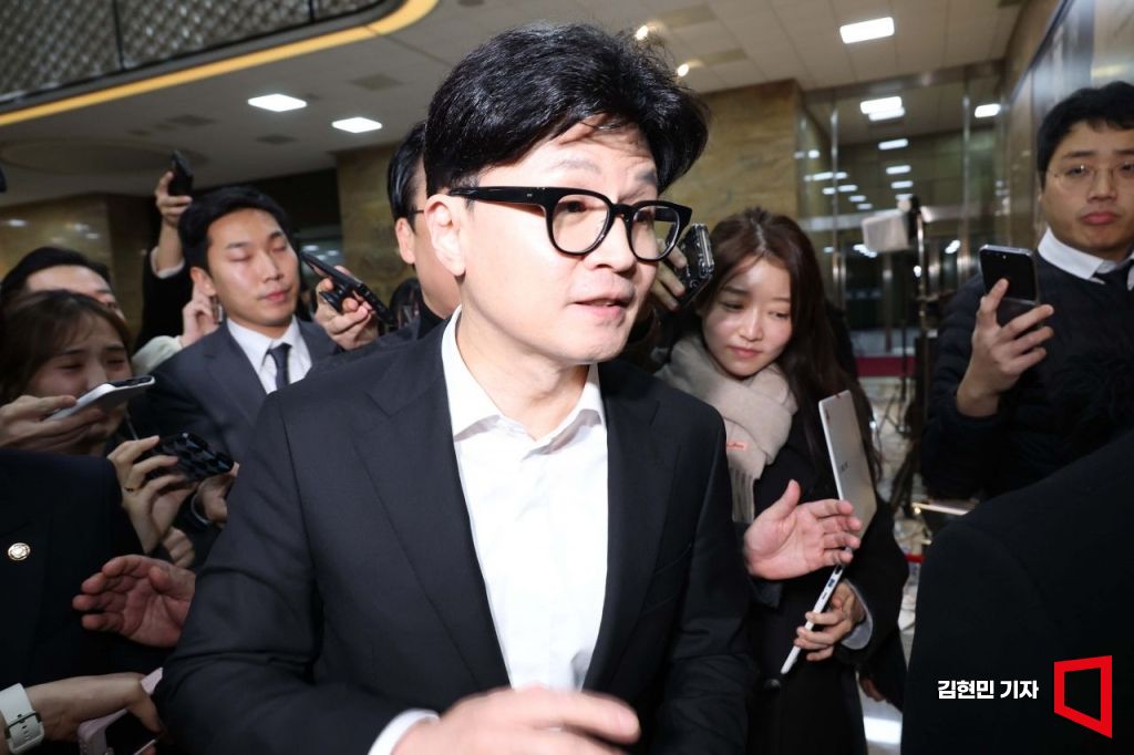 한동훈 국민의힘 대표가 14일 국회에서 윤석열 대통령 탄핵소추안이 가결된 뒤 열린 의원총회장에서 나서고 있다. 김현민 기자