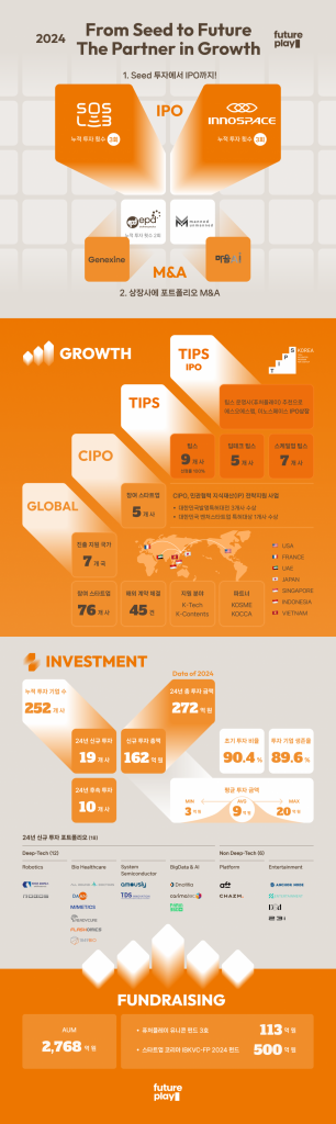퓨처플레이가 올해 성과를 집약한 인포그래픽(정보 그림) ‘퓨처플레이 2024, 시드에서 미래를 연결하는 성장의 동반자’를 16일 공개했다.
