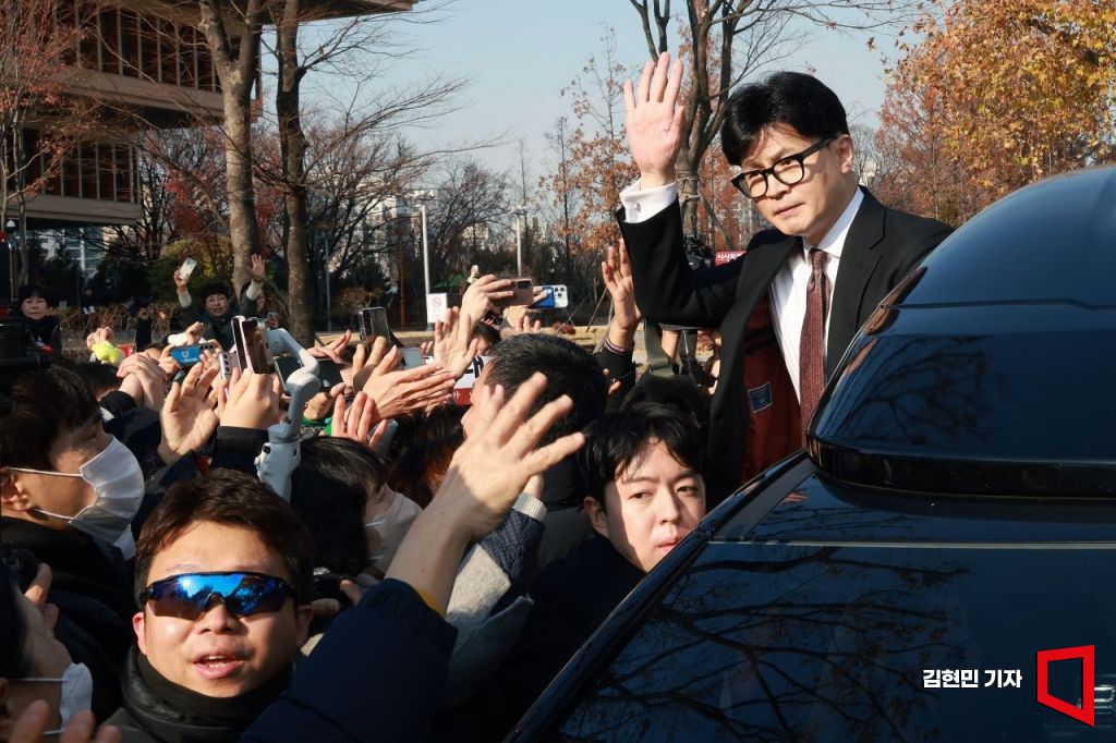 한동훈 국민의힘 대표가 16일 국회에서 당대표 사퇴 관련 기자회견을 마치고 지지자들과 인사하고 있다.