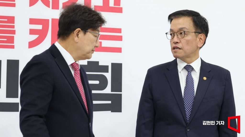 권성동 국민의힘 원내대표(왼쪽)가 16일 국회에서 최상목 경제부총리 겸 기획재정부 장관과 만나 인사하고 있다.