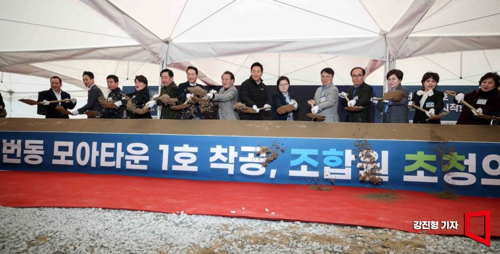 오세훈 서울시장을 비롯한 주요 내빈 및 지역 주민들이 16일 서울 강북구 번동 모아타운 지역에서 열린 '번동 모아타운 착공 초청의 날'에 참석해 시삽을 하며 공사 시작을 알리고 있다. 서울시의 노후 저층주거지 정비모델인 '모아타운' 1호로 선정된 강북구 번동 모아타운이 세입자 이주를 끝내고 마침내 공사에 들어간다. 시가 모아타운·모아주택 추진계획을 발표한 지 약 3년 만이다. 번동 모아타운은 2022년 1월 모아타운·모아주택 추진계획 발표와 함께 시범사업 대상지로 선정돼 그간 시와 강북구의 전폭적 행정지원을 받아 빠르게 진행돼 왔다. 지난달부터 철거를 시작해 2028년 준공·입주 예정이다.