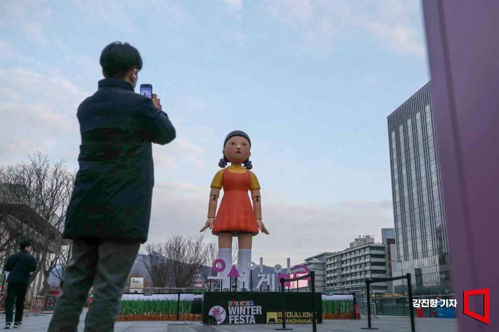17일 서울 종로구 광화문광장에 넷플릭스 드라마 '오징어게임' 캐릭터 '영희' 조형물이 설치돼 있다. 서울시는 윈터페스타 기간 동안 K콘텐츠의 주목도를 높이기 위해 이달 개봉하는 넷플릭스 드라마 ‘오징어게임 시즌2’와 협업해 특별전시를 연다.