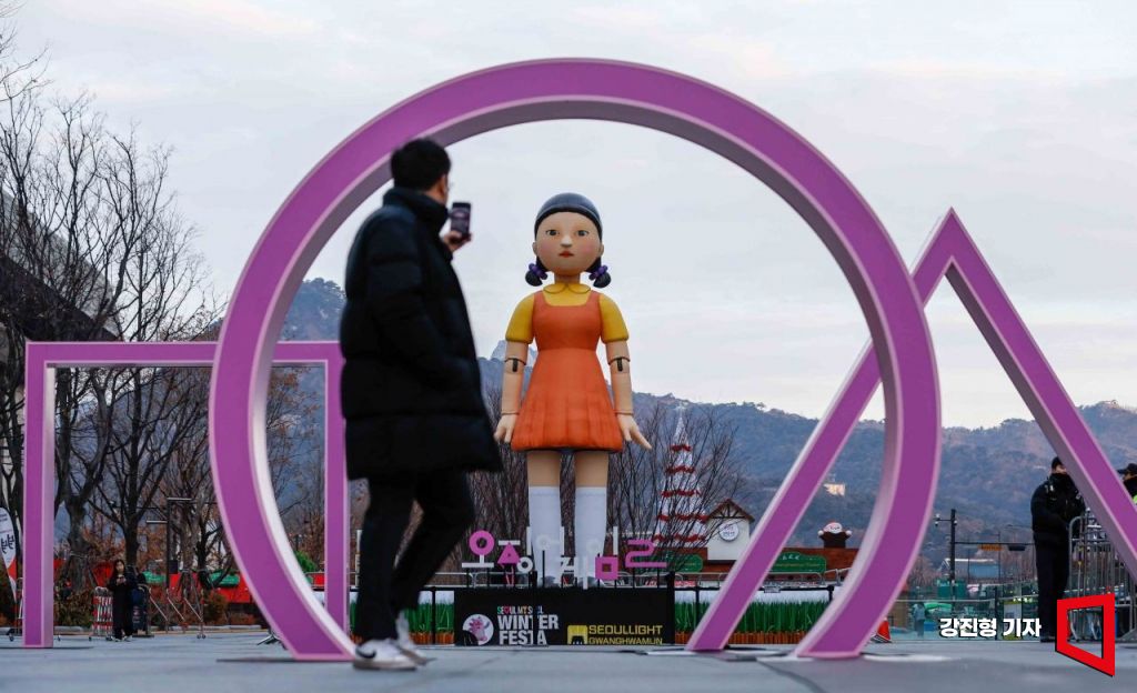 17일 서울 종로구 광화문광장에 넷플릭스 드라마 '오징어게임' 캐릭터 '영희' 조형물이 설치돼 있다. 서울시는 윈터페스타 기간 동안 K콘텐츠의 주목도를 높이기 위해 이달 개봉하는 넷플릭스 드라마 ‘오징어게임 시즌2’와 협업해 특별전시를 연다.