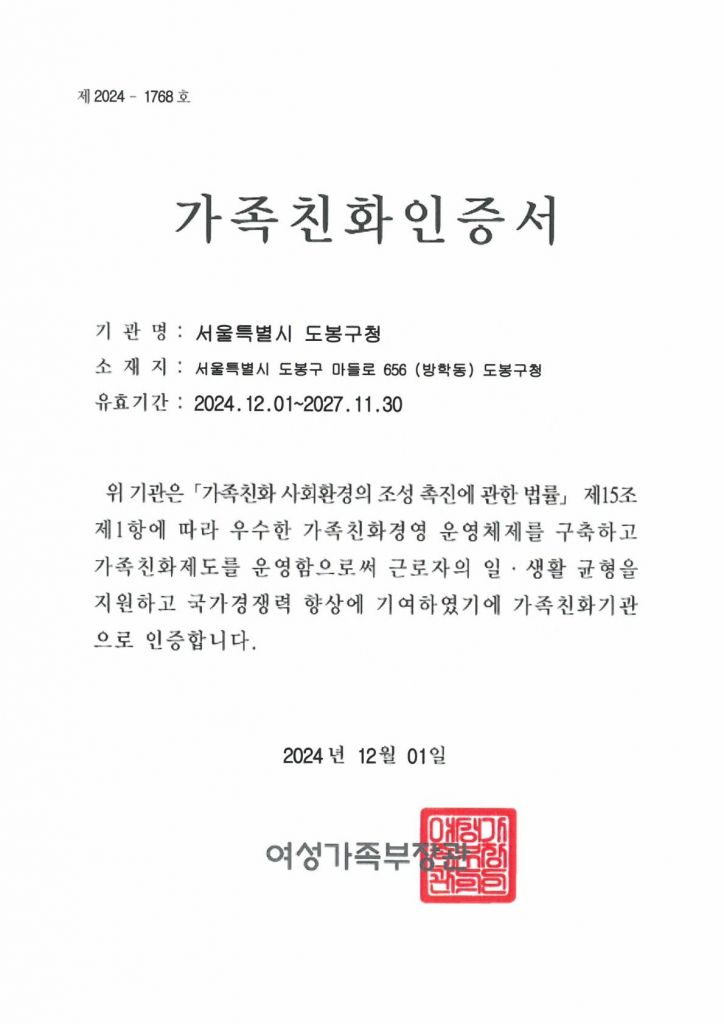 도봉구(구청장 오언석)가 여성가족부로부터 가족친화기관 재인증을 받았다고 밝혔다.