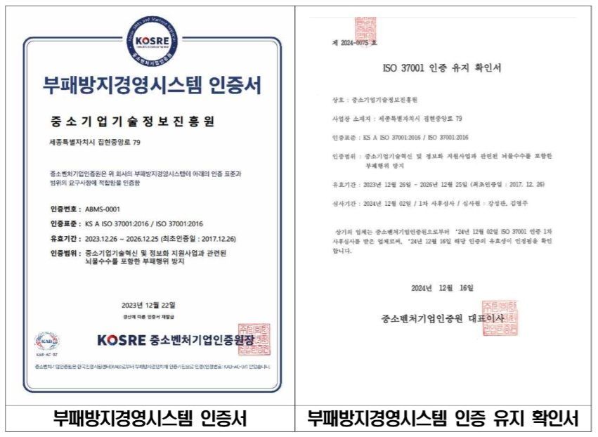 부패방지경영시스템(ISO 37001) 인증서 및 인증 유지 확인서 사본. TIPA 제공