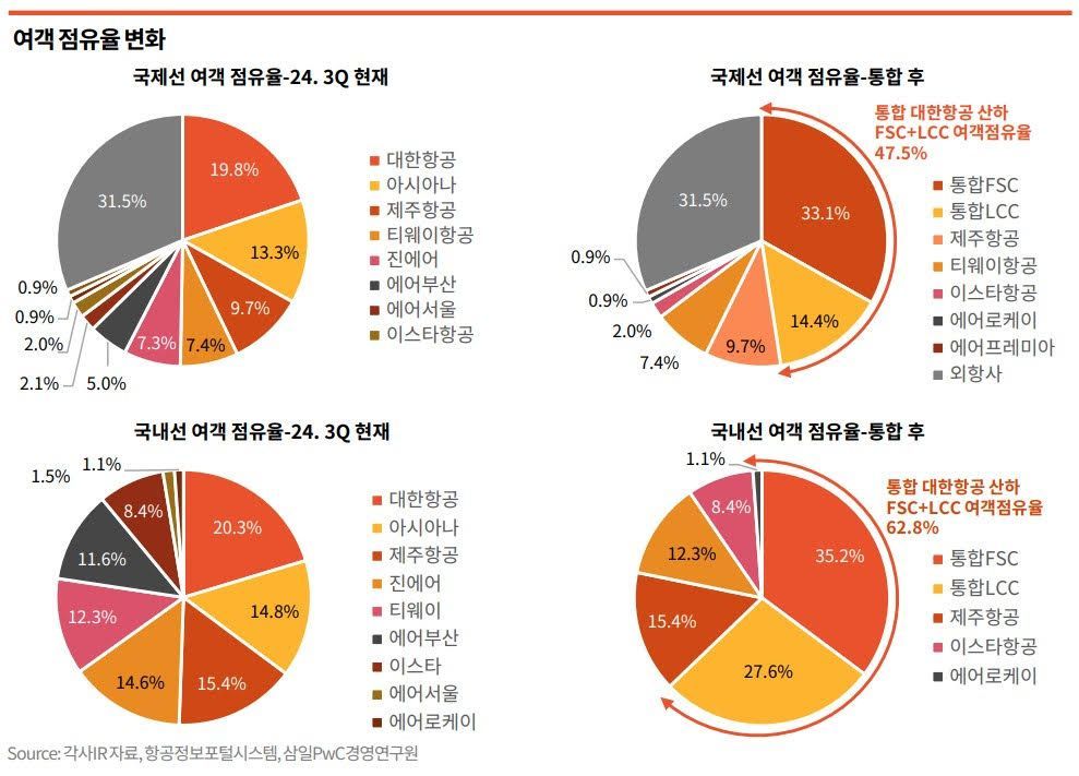 보고서에 따르면 항공사 대형화가 이뤄지며, 여객 부문에서는 공급 능력(제공 노선 및 서비스 확대)이 향상될 것으로 보인다. 또한 양사 산하의 진에어, 에어서울, 에어부산 등 저비용항공사(LCC) 통합에 따라 LCC 내 점유율 1위(41%)로 등극하면서 규모의 경제 효과도 기대된다.