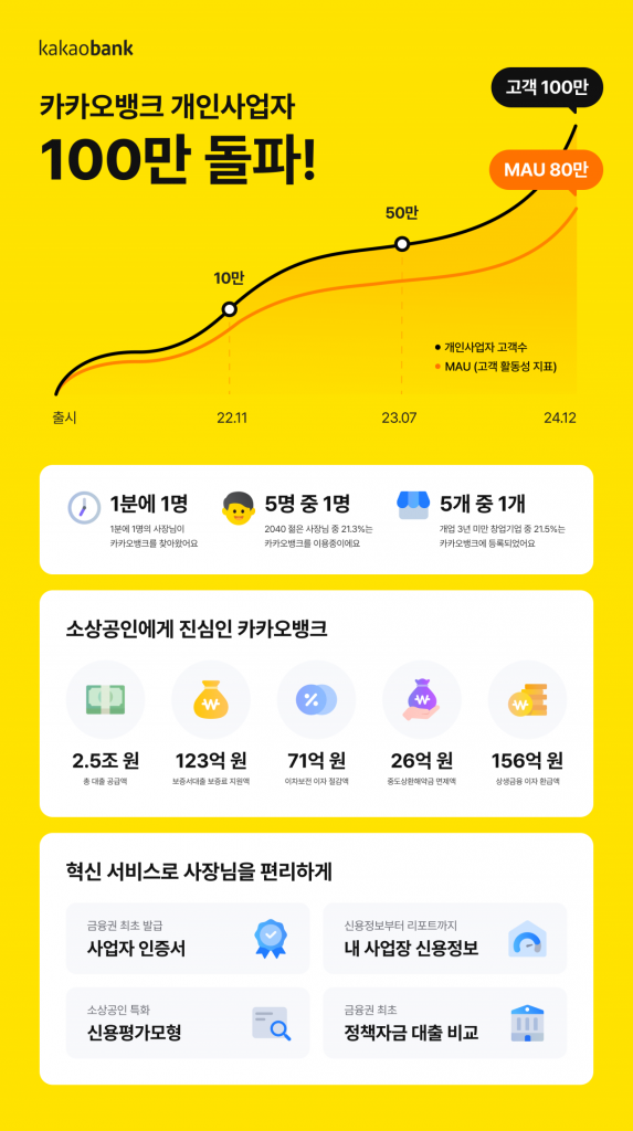 카카오뱅크는 지난 2022년 11월 개인사업자 뱅킹을 출시한 이후 출시 2년 만에 '100만 사업자'를 돌파했다. 출시 이후 2주 만에 10만, 10개월 만에 50만을 달성하는 등 가파른 증가세를 보인 바 있다. 이는 1분마다 1명 이상의 개인사업자가 카카오뱅크에 가입한 셈이다.