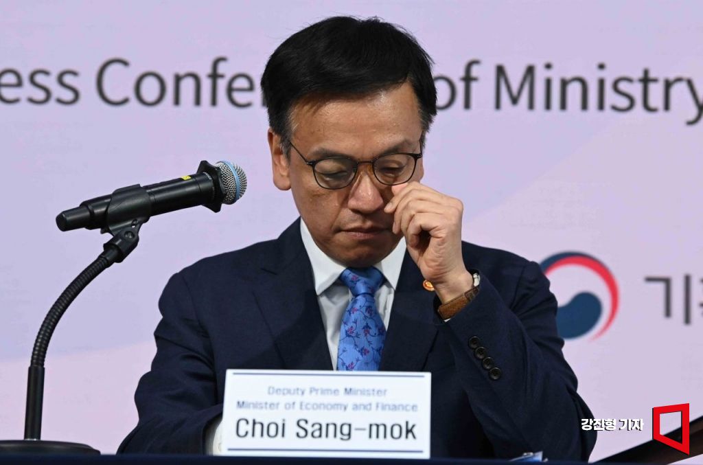 최상목 경제부총리 겸 기획재정부 장관이 18일 오전 서울 중구 프레스센터에서 열린 공동 외신기자간담회에서 안경을 만지고 있다.