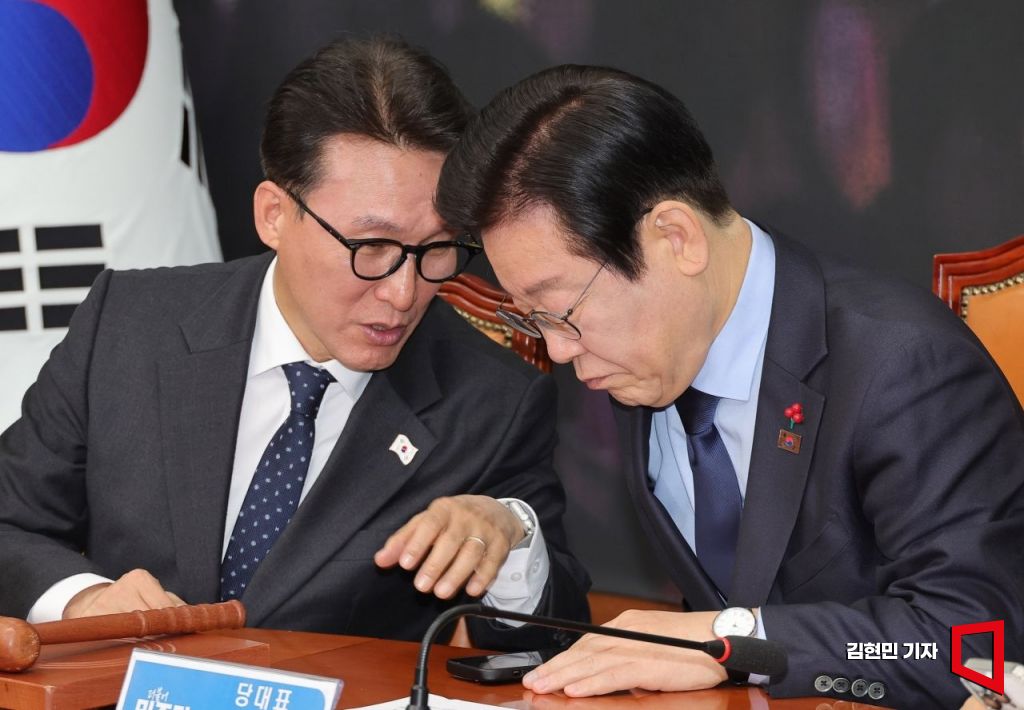 이재명 더불어민주당 대표가 18일 국회에서 열린 최고위원회의에서 김민석 최고위원과 대화하고 있다.