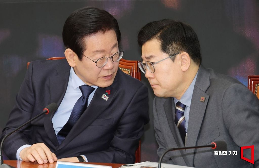 이재명 더불어민주당 대표가 18일 국회에서 열린 최고위원회의에서 박찬대 원내대표와 대화하고 있다.