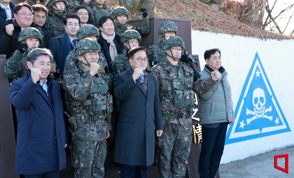 우원식 국회의장이 18일 오전 강원도 철원군 3사단 백골 OP에서 정재열 3사단장을 비롯한 관계자들과 기념촬영을 하고 있다. 국회사진기자단