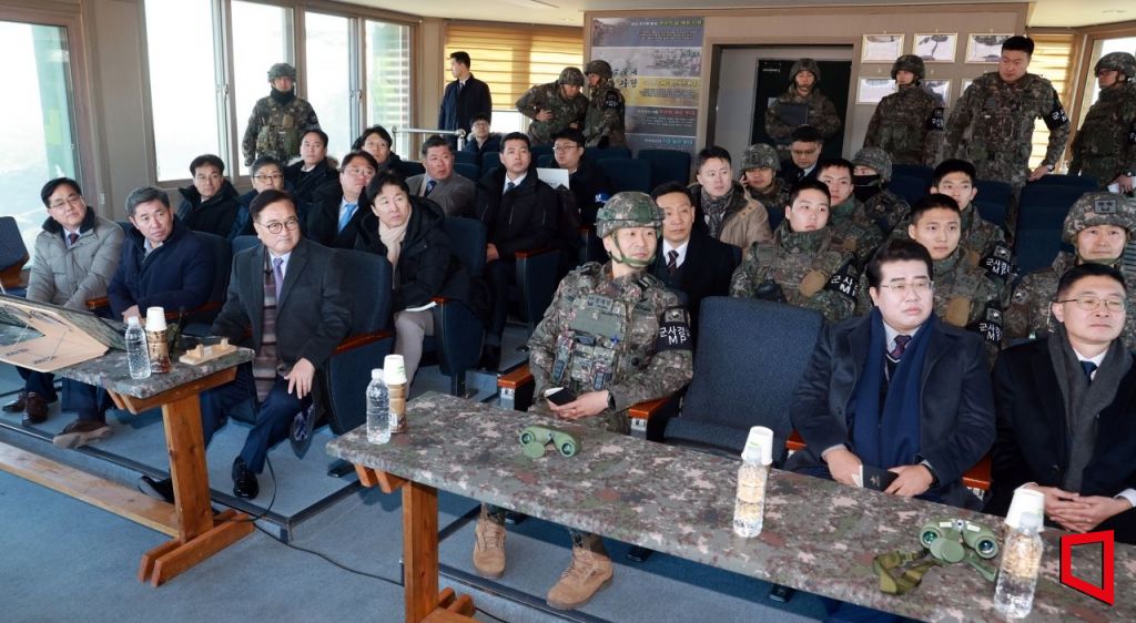 우원식 국회의장이 18일 오전 강원도 철원군 3사단 백골 OP를 방문해 소개영상을 바라보고 있다. 국회사진기자단