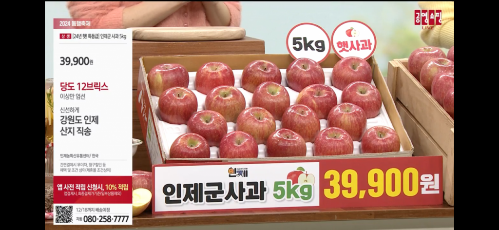 공영홈쇼핑 방송을 통해 판매된 사과는 집에서 먹기 좋은 사이즈로 한 개당 250~277g 크기로, 5kg 한 박스에 18~20과로 구성됐다. 가격은 5kg당 39,900원으로, 저렴한 가격에 신선하고 맛 좋은 인제산 햇사과가 판매됐다.