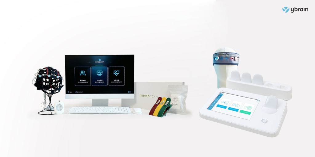 와이브레인의 BCI의 핵심 축인 뇌파 진단 장비 마인드스캔(왼쪽)와 우울증 전자약 마인드스팀 이미지. 와이브레인 제공