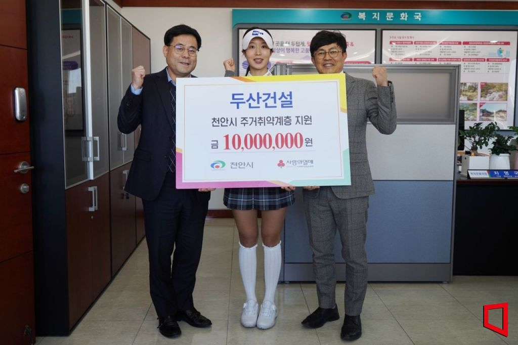 두산건설은 18일 천안 지역 주거취약계층을 위한 기부금 1000만 원을 천안시에 전달했다고 밝혔다. 이날 천안시청에서 진행된 기부금 전달식에는 차명국 천안시 복지문화국장, 오세욱 두산건설 상무, 두산건설 위브 골프단 유효주 프로가 참석했다.