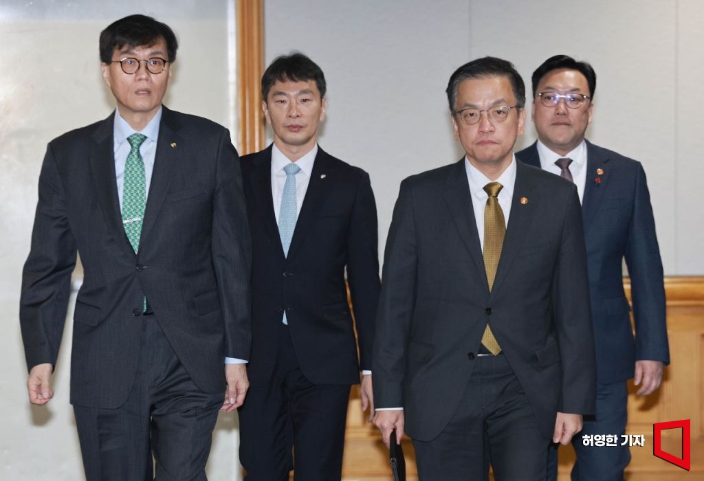 19일 서울 명동 은행회관에서 열린 거시경제금융회의를 위해 최상목 경제부총리 겸 기획재정부 장관(왼쪽 세번째)과 이창용 한국은행 총재, 이복현 금융감독위원장, 김병환 금융위원장이 회의실로 들어서고 있다.
