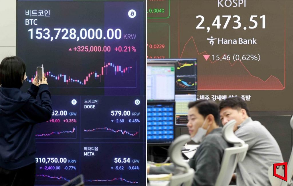 탄핵 정국 이후 국내 증시는 4거래일 연속 상승하다 숨을 고르는 반면, 가상자산 대장주 비트코인은 장중 10만7천800달러선을 터치하며 연일 사상 최고가를 경신하고 있다. 사진은 17일 서울 강남구 업비트 고객센터 전광판에 표시된 비트코인 시세와 서울 중구 하나은행 본점 딜링룸 전광판에 표시된 코스피 지수. 허영한·강진형 기자