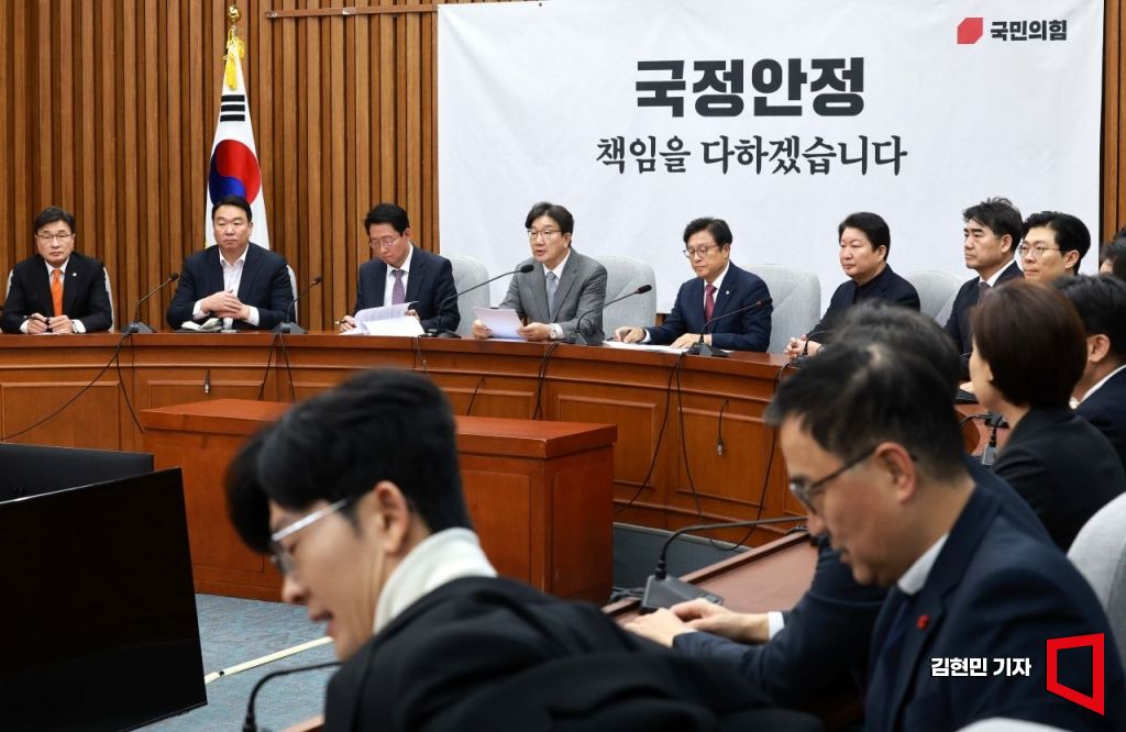 권성동 국민의힘 당대표 권한대행 겸 원내대표가 19일 국회에서 열린 원내대책회의에서 발언하고 있다.