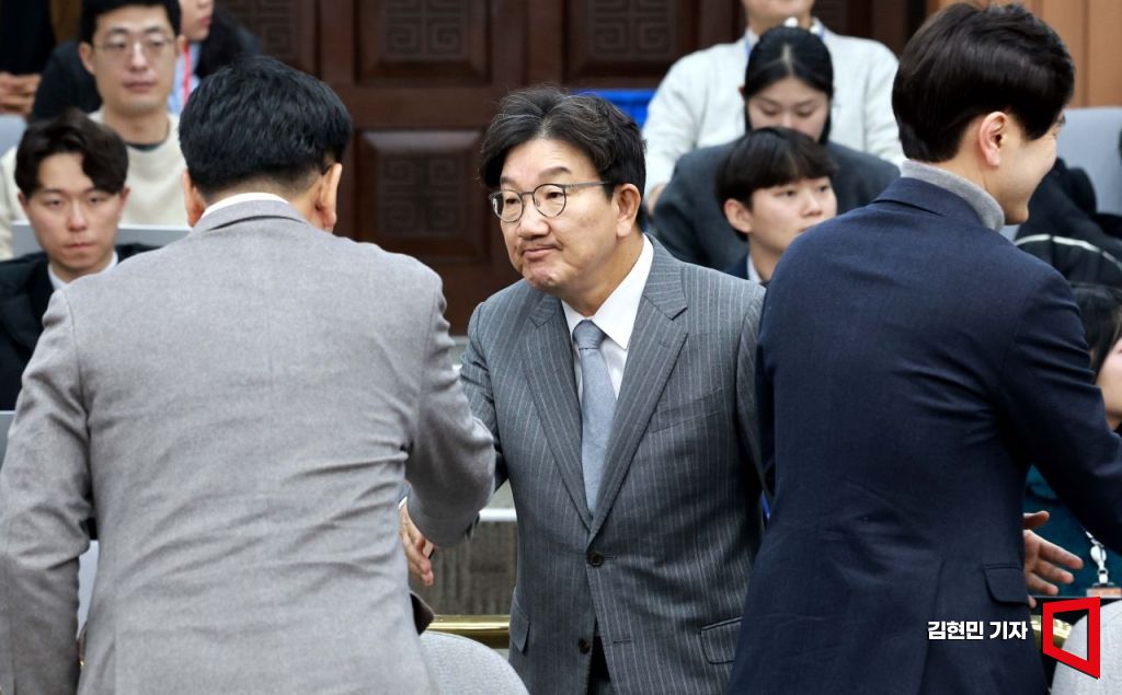 권성동 국민의힘 당대표 권한대행 겸 원내대표가 19일 국회에서 열린 원내대책회의에 참석하고 있다.