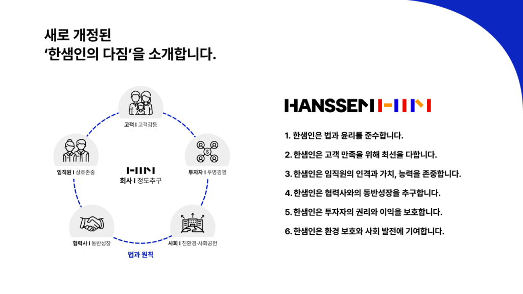 한샘인의 다짐에는 한샘과 임직원이 주요 이해관계자와의 관계에서 지켜야 할 윤리적 가치와 목표를 담았다. 총 6개 조문 및 18개 항목으로 구성됐다. 6개 조문은 ‘한샘인은 법과 윤리를 준수합니다’, ‘한샘인은 고객 만족을 위해 최선을 다합니다’, ‘한샘인은 임직원의 인격과 가치, 능력을 존중합니다’, ‘한샘인은 협력사와의 동반 성장을 추구합니다’, ‘한샘인은 투자자의 권리와 이익을 보호합니다’, ‘한샘인은 환경 보호와 사회 발전에 기여합니다’ 등이다.