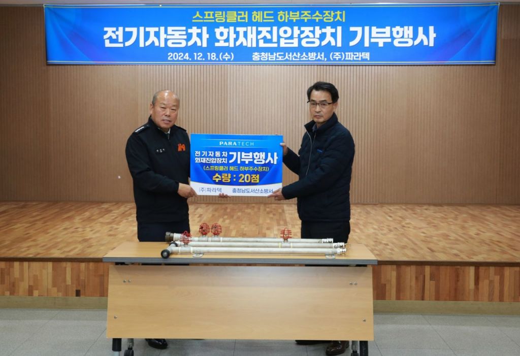 소방설비 제조 및 시공 전문기업 파라텍은 서산소방서에 전기차 화재진압장비 ‘스프링클러헤드 하부주수장치’ 20대를 기부했다고 19일 밝혔다.