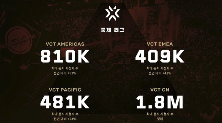 VCT EMEA(유럽·중동·아프리카)는 40만9000명으로 41% 늘었으며 올해부터 진행된 VCT CN(중국)은 180만명을 달성했다.