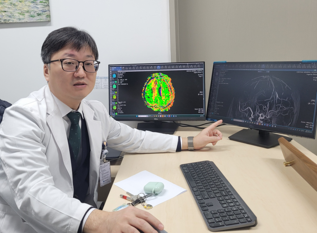 센텀종합병원 이동혁(신경외과 전문의) 과장이 급성 뇌경색 환자에 대한 혈전 제거술을 설명하고 있다. 센텀종합병원 제공