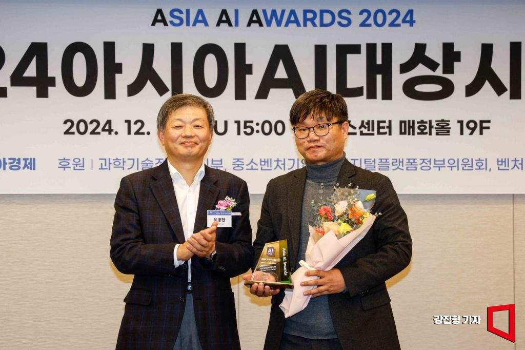 정일옥 이글루코퍼레이션 AiR총괄 기술위원이 19일 서울 중구 프레스센터에서 열린 '2024 아시아AI대상 시상식'에서 아시아경제대표상(AI 윤리상)을 수상하고 있다.