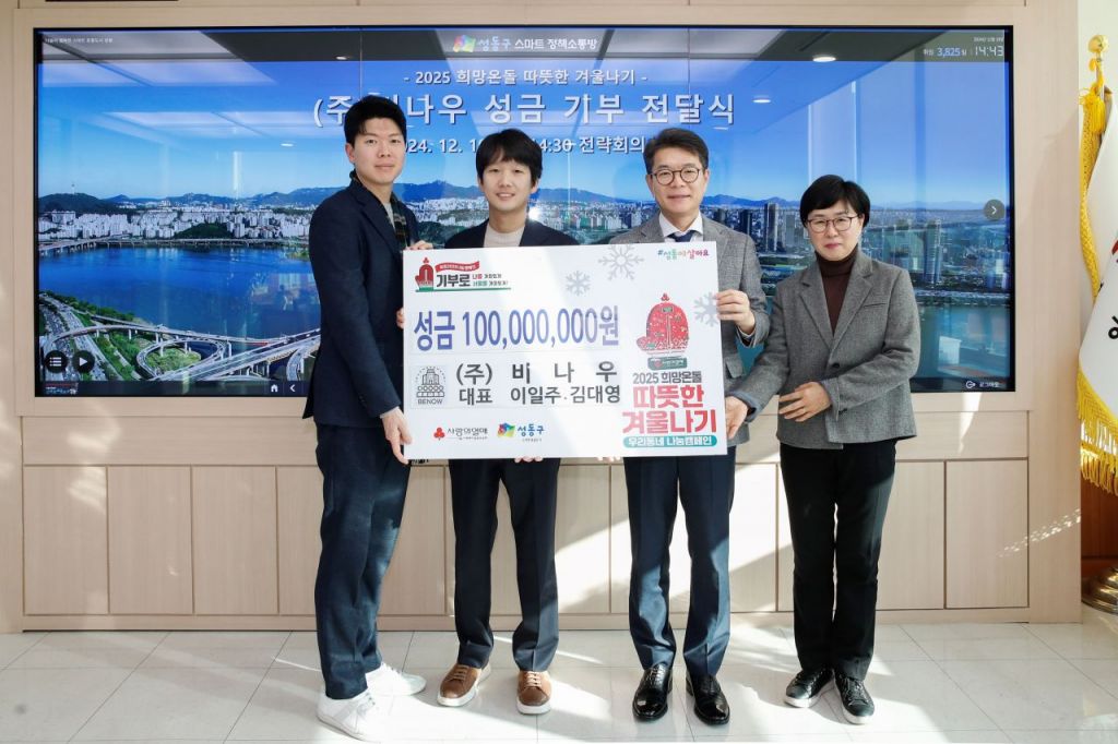 서울 성동구(구청장 정원오)가 지난 12월 19일 비나우(대표 이일주, 김대영)로부터 저소득 여성복지를 위한 ‘2025 희망 온돌 따뜻한 겨울나기’ 성금 1억 원을 전달받았다.