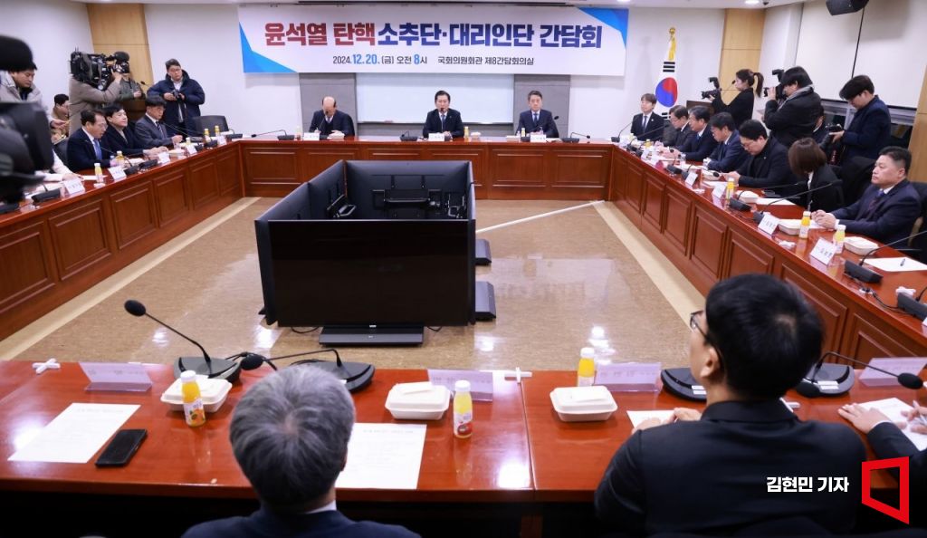 20일 국회 의원회관에서 열린 윤석열 탄핵소추단·대리인단 간담회에서 소추단장인 정청래 국회 법제사법위원장이 발언하고 있다.