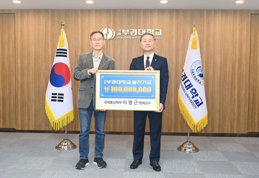 이병근 명예교수는 최근 국립부경대 대학본부 3층 총장실에서 열린 발전기금 전달식에서 배상훈 총장에게 1억원을 전달했다.